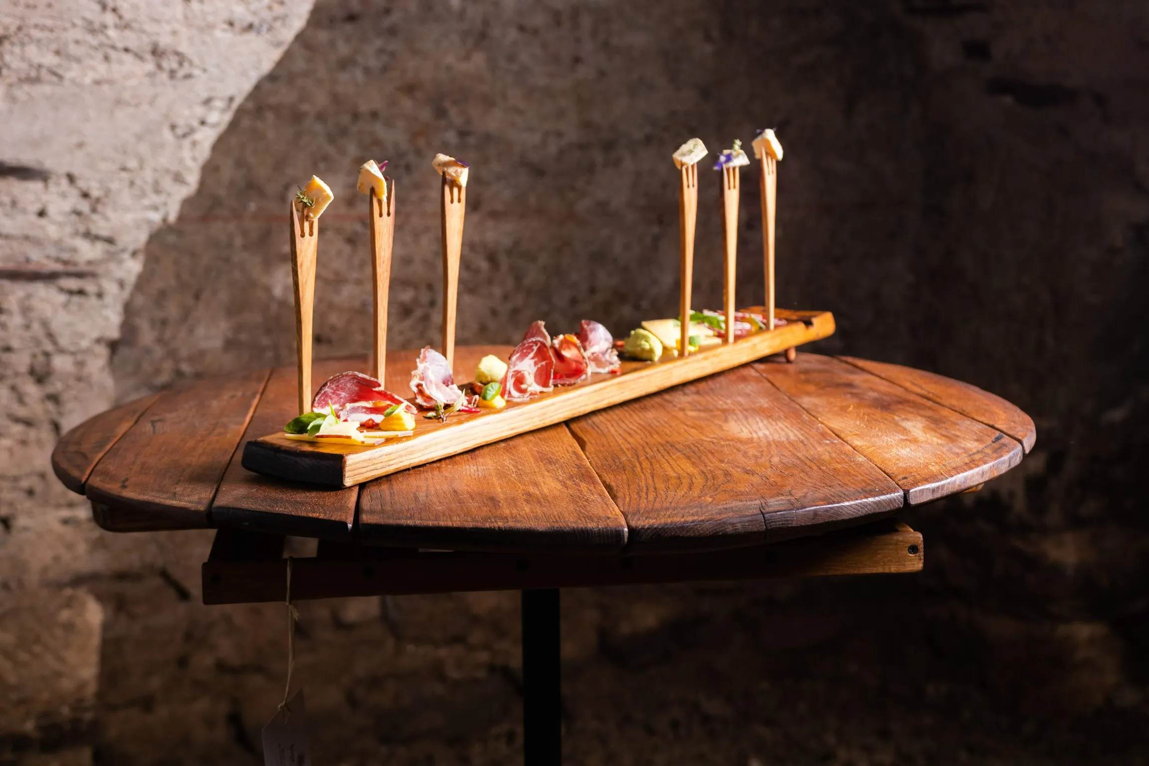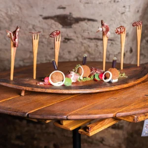 Deska za narezek narejena iz doge vinskega soda ali škafa v kompletu s šestimi vilicami, prav tako narejenih iz lesa vinskega soda. Naoljeno z oljem grozdnih pečk. Deska ima luknje za nasaditev lesenih vilic in dve nogice za lažje postavitev na mizo.